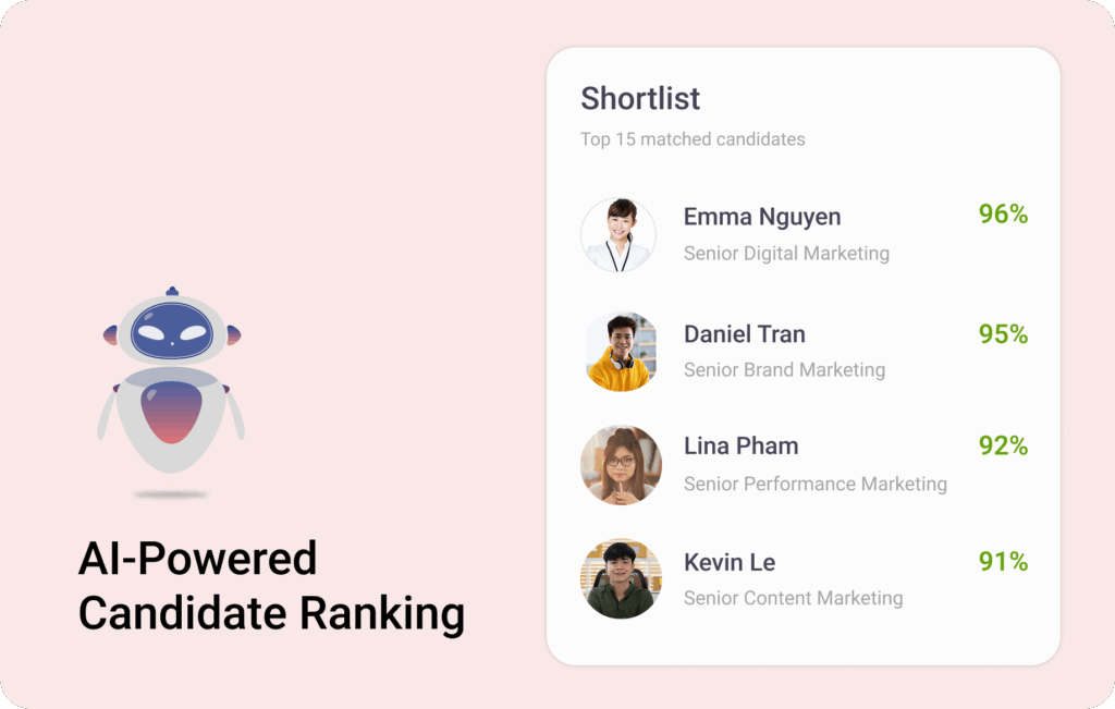 Tự động sàng lọc, xếp hạng ứng viên và rút ngắn quy trình tuyển dụng bằng công nghệ AI tiên tiến.