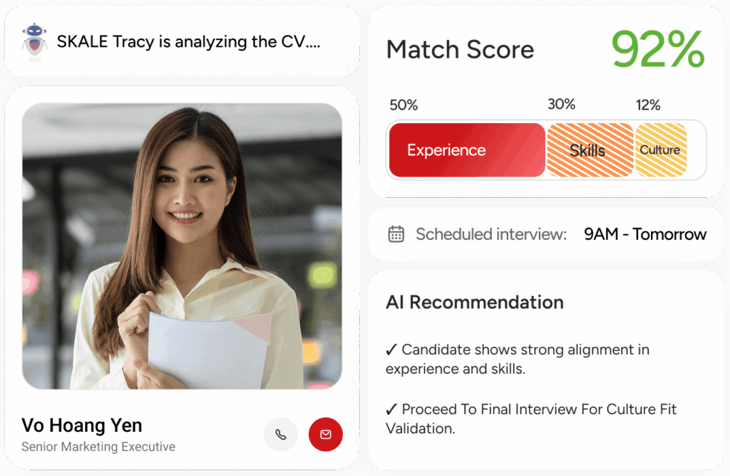 Tuyển dụng và phát triển nhân tài là hành trình song hành giữa dữ liệu và con người. Đó là lý do SKALE kết hợp công nghệ AI và tư vấn chiến lược để tạo tác động thực tế.