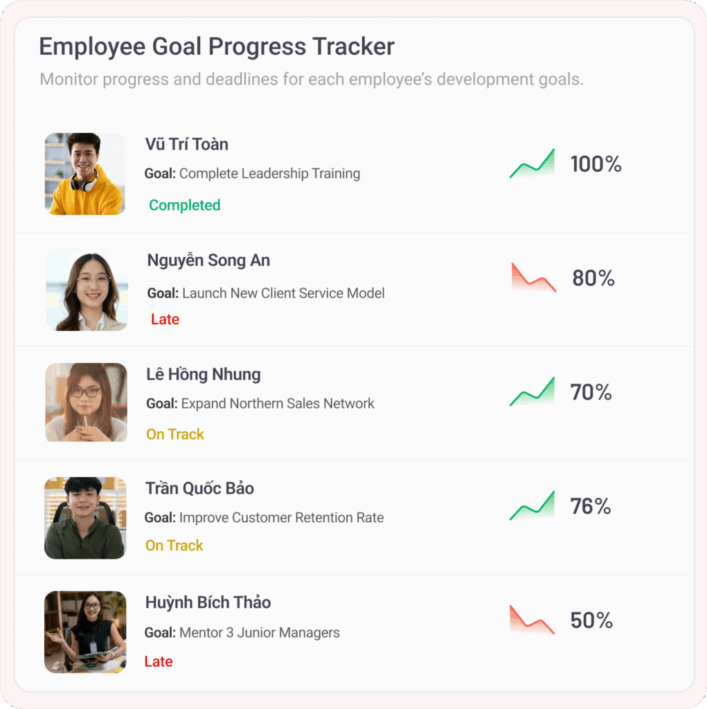 Tối ưu hiệu suất cá nhân và đội nhóm thông qua dữ liệu KPI, phản hồi 360° và tư vấn quản trị nhân tài chuyên sâu.