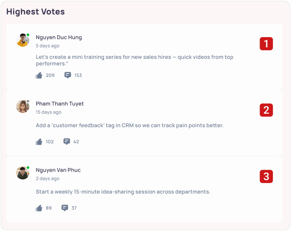 Nền tảng lan tỏa văn hóa doanh nghiệp bằng cách ghi nhận, cảm ơn và truyền cảm hứng giữa đồng nghiệp. Công cụ giúp trân trọng thành quả, khuyến khích hành vi tích cực và tạo động lực làm việc mỗi ngày