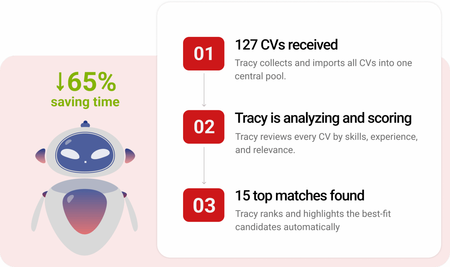 Tracy AI automatically analyzes, ranks, and recommends candidates who match job requirements—helping businesses save time and increase the accuracy of every decision.